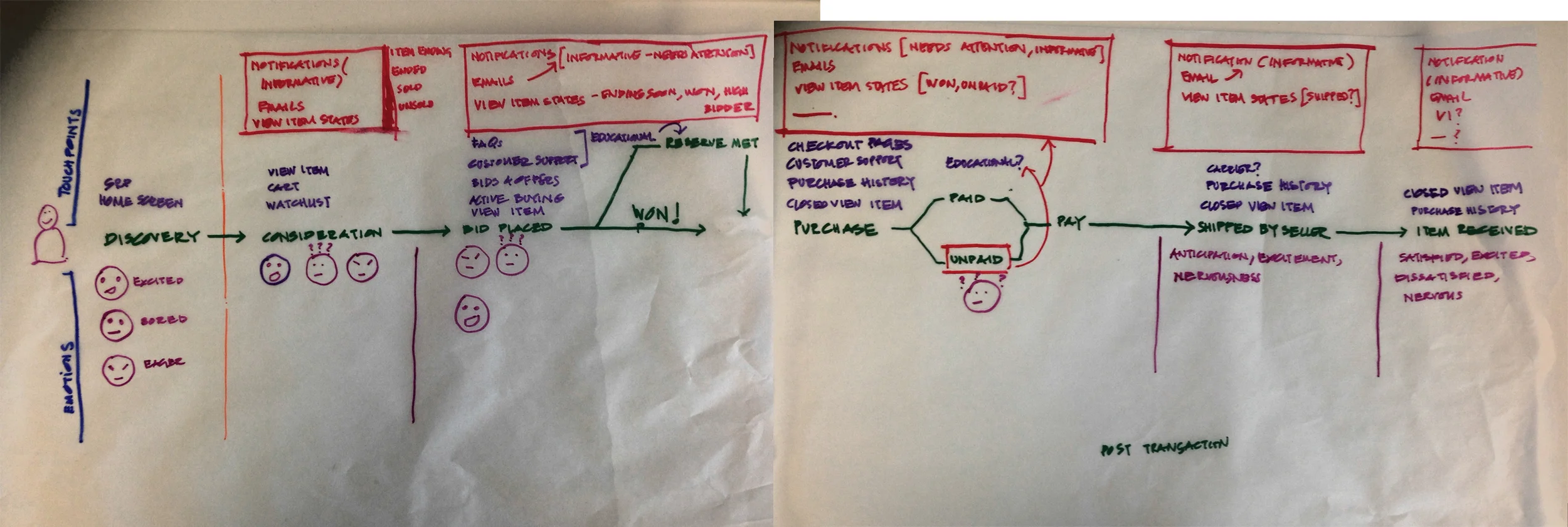 Documenting the various states that an item transitions through and assessing if the existing IA communicated the required messaging to the buyer. There was a huge gap here from when a buyer bought an item and needed to pay for it (in the case of auction items and offers) and for a seller, when an item sold and it needed to be shipped.