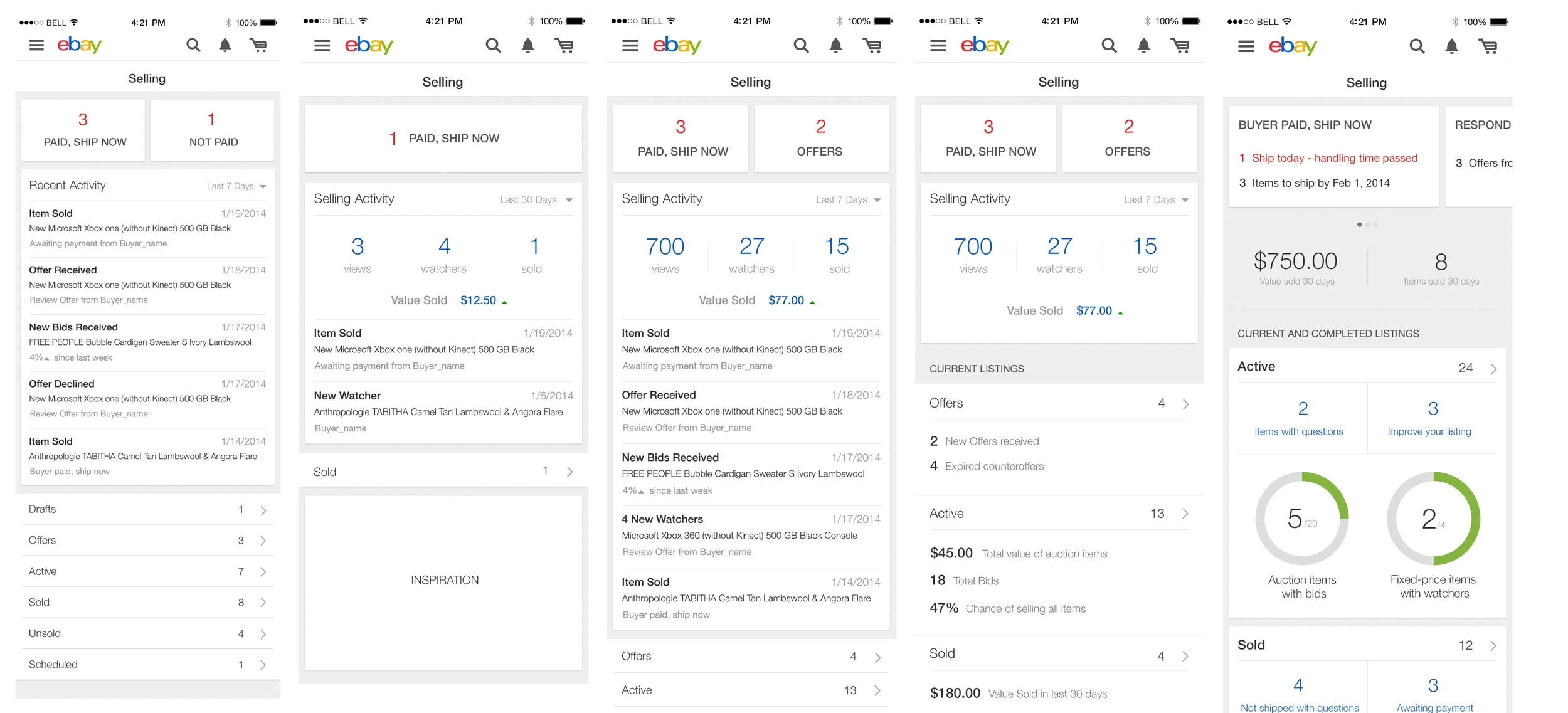 One of the goals of this rethink is the need for a consistent experience and a common design language across all mobile devices (and eventually the web). Working and collaborating across domains, Product, and Engineering was critical to achieving this goal. Functionality wise, the app focuses on the user activity, the retail experience, and the seller experience, with the old "My eBay", i.e, watching, buying, and selling destinations being subsidiaries of these experiences.