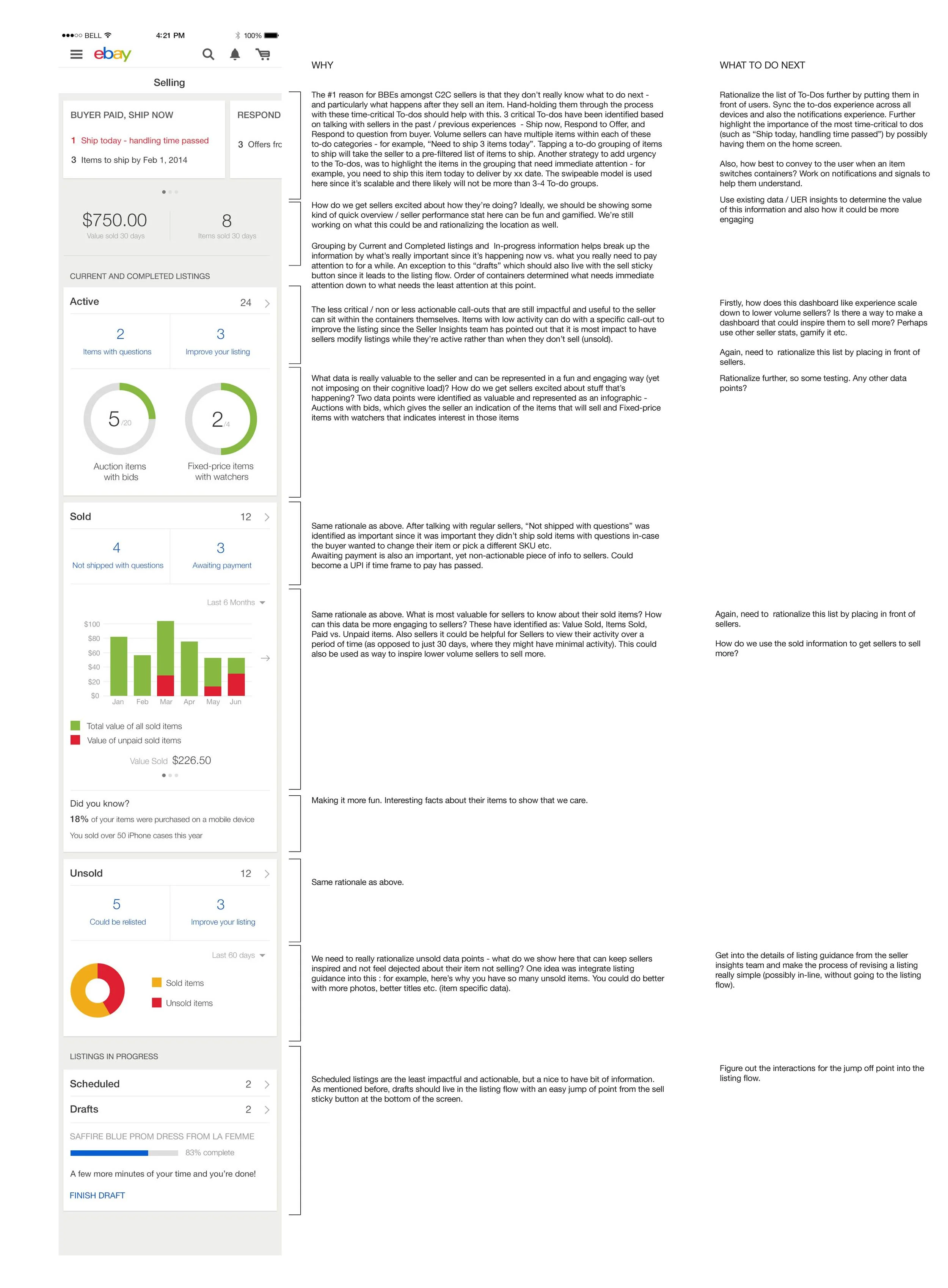 The seller experience is always the most challenging, and various seller scenarios (from a casual seller to a high volume seller) were storyboarded.
